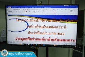 วันศุกร์ที่ 23 มกราคม 2569 นายทวีศักดิ์ ทวีรัตน์ นายกเทศมนตรีเมืองคอหงส์มอบหมาย นายนที เรณุมาศ รองนายกเทศมนตรีเมืองคอหงส์ เป็นประธานในการประชุมเครือข่ายองค์กรด้านสังคมสงเคราะห์เทศบาลเมืองคอหงส์ ตามโครงการเสริมสร้างความเข้มแข็งคณะกรรมการศูนย์สงเคราะห์ราษฎรประจำชุมชน และเครือข่ายองค์กรด้านสังคมสงเคราะห์ ประจำปีงบประมาณ 2569 เพื่อร่วมปรึกษาหารือแนวทางการดำเนินงานของเครือข่ายองค์กรด้านสังคมสงเคราะห์ในด้านต่างๆ ภายในเขตเทศบาลเมืองคอหงส์ ณ ห้องเสม็ดชุน 1 ชั้น 4 สำนักงานเทศบาลเมืองคอหงส์