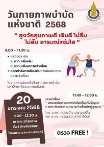 ขอเชิญทุกท่านร่วมงาน “สูงวัยสุขภาพดี เดินดี ไม่ล้ม ไม่ลืม อารมณ์แจ่มใส” วันที่จันทร์ที่ 20 มกราคม 2568 เวลา 9.00 – 12.30 น. ณ ลานเวทีสุขภาพ ชั้น 1 ข้างห้องรับยา โรงพยาบาลสงขลานครินทร์