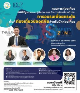 กรมการท่องเที่ยวขอเชิญ ผู้ประกอบการ และผู้ให้บริการท่องเที่ยว ร่วมกิจกรรมอบรม “Safety Zone…Safety by Design ออกแบบความปลอดภัยที่มีสไตล์”ภายใต้โครงการพัฒนาพื้นที่ท่องเที่ยวปลอดภัยสำหรับนักท่องเที่ยว (Safety Zone) ประจำปี พ.ศ. 2568 เพื่อเตรียมความพร้อมต้อนรับ SEA Games 2025