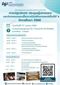 ขอเชิญนักศึกษาและผู้ปกครองร่วมงาน  ปฐมนิเทศ ประชุมผู้ปกครอง และกิจกรรมรับเสื้อกาวน์  นักศึกษาแพทย์ชั้นปีที่ 4 ปีการศึกษา 2568  ในวันอาทิตย์ที่ 27 เมษายน 2568 เวลา 08.00 – 12.00 น.  ณ ห้องประชุมภูผาเมฆ ชั้น 3  โรงแรมทีอาร์ ร็อคฮิลล์ อ.หาดใหญ่ จ.สงขลา  ตอบรับเข้าร่วมงานได้ที่ลิงค์นี้