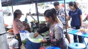 คุณภัคจิรา คำแต้ม เจ้าของร้านข้าวเหนียวหมูทอดห่อใบตอง กล่าวว่า ช่วงกินเจก็ยังโอเคอยู่ ยังขายได้ปกติ ยอดขายก็โอเคอยู่ ลูกค้าก็เหมือนเดิม เพราะเรายังขายราคาห่อละ 20 บาทอยู่ ขณะนี้วัสดุที่มาทำ หมูราคาลดลง แต่ถ้าเป็นส่วนอย่างอื่นที่เป็นเครื่องปรุงราคาแพงขึ้น แต่เราก็เอาลูกค้าไว้ก่อน โดยเราจะขายเน้นลูกค้าลูกค้าอยู่ได้ เราก็อยู่ได้ เรายังขายราคาเดิมอย่างต่ำก็ 20 บาทส่วนลูกค้าจะสั่งพิเศษอย่างไรก็แล้วแต่ลูกค้าแต่ขั้นต่ำก็เริ่มที่ 20 บาทที่สำคัญเทศกาลกินเจไม่มีผลกระทบแต่อย่างใด