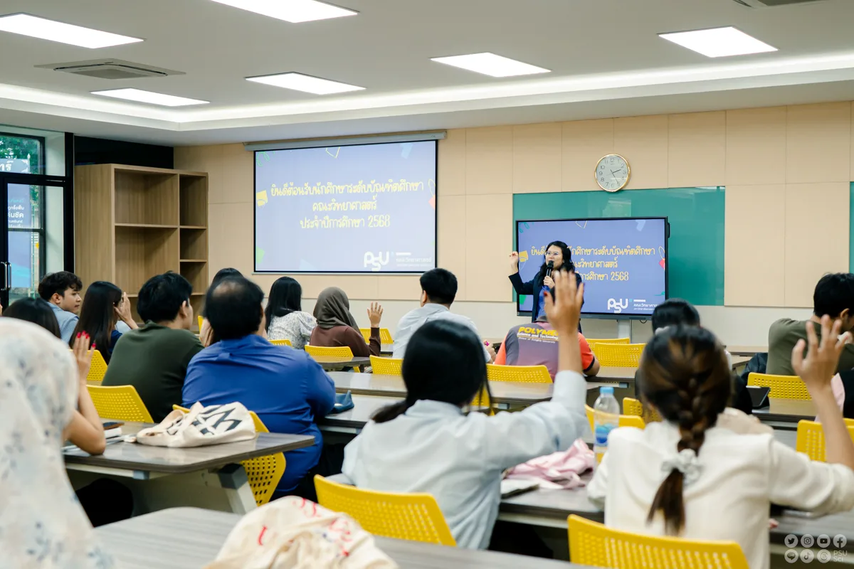 เมื่อวันจันทร์ที่ 16 มิถุนายน 2568 คณะวิทยาศาสตร์ มหาวิทยาลัยสงขลานครินทร์ ได้จัดกิจกรรม ปฐมนิเทศนักศึกษาระดับบัณฑิตศึกษา ประจำปีการศึกษา 2568 ณ ห้อง วท.1 อาคารวิทยาศาสตร์และเทคโนโลยี เพื่อเตรียมความพร้อมด้านแนวคิด ทักษะการเรียนรู้ และการสนับสนุนทางวิชาการแก่ผู้เข้าศึกษาในระดับปริญญาโทและปริญญาเอก โดยมีศาสตราจารย์ ดร.อัญชนา ประเทพ คณบดีคณะวิทยาศาสตร์ เป็นประธานกล่าวต้อนรับและให้โอวาทเชิงสร้างแรงบันดาลใจ