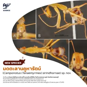 2. มดตะลานคูหารัตน์ (Camponotus (Tanaemyrmex) sirindhornae) sp. nov. ซึ่งเป็นมดที่พบอาศัยในระบบนิเวศถ้ำและอุโมงค์ใต้ดิน ในอำเภอทองผาภูมิ จังหวัดกาญจนบุรี โดยทำวิจัยร่วมกับทีมวิจัยจากองค์การพิพิธภัณฑ์วิทยาศาสตร์แห่งชาติ (ดร.วียะวัฒน์ ใจตรง และคุณทัศนัย จีนทอง) มหาวิทยาลัยราชภัฎกาญจนบุรี (ดร.ปิยะพร พิทักษ์ตันสกุล อาจารย์จิราพร โพธิ์งาม) และมหาวิทยาลัยราชภัฎสุรินทร์ (ผศ.ดร.ยุพเยาว์ โตคีรี) ซึ่งได้รับการตีพิมพ์ในวารสาร Tropical Natural History อย่างเป็นทางการ