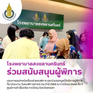 รศ.ดร.พญ.มณฑิรา ตัณฑนุช ประธานองค์กรแพทย์ โรงพยาบาลสงขลานครินทร์ พร้อมด้วยเจ้าหน้าที่จากงานสิทธิประโยชน์ โรงพยาบาลสงขลานครินทร์ และบุคลากรจากสาขาวิชาต่างๆ ร่วมออกบูธ เพื่อให้บริการผู้พิการ ที่มาร่วมงานวันคนพิการสากล ประจำปี 2568 ที่จัดขึ้น ณ หาดใหญ่ฮอลล์ (Hatyai Hall) ชั้น 5 ศูนย์การค้าเซ็นทรัล หาดใหญ่ จังหวัดสงขลา โดยมีนายวิทยา จันทร์เสนะ รองผู้ว่าราชการจังหวัดสงขลา เป็นประธานในพิธี
