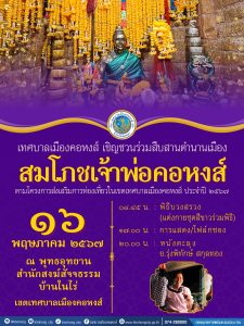 เทศบาลเมืองคอหงส์ เชิญชวนพี่น้องชาวคอหงส์ และพื้นที่ใกล้เคียง ร่วมสืบสานตำนานเมืองคอหงส์ ในงานสมโภชเจ้าพ่อคอหงส์ ตามโครงการส่งเสริมการท่องเที่ยวในเขตเทศบาลเมืองคอหงส์ ประจำปี 2567