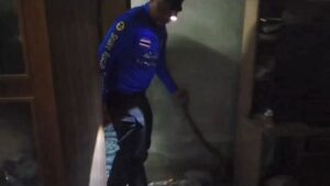 โดยใช้เวลานานประมาณ 3 นาทีเศษ ก็สามารถจับหางงูและดึงออกมานอกบ้าน ก่อนเจ้าหน้าที่ชุดดังกล่าวสามารถจับงูจงอางไว้ได้นำมาวัดได้ความยาวถึง 3.69 เมตร จึงนำใส่กระสอบเตรียมนำไปปล่อยคืนสู่ป่าธรรมชาติเพื่อความปลอดภัยของชาวบ้านต่อไป แน่นอนชาวบ้านที่มายืนดูการจับงูจงอางในครั้งนี้ ต่างนำเอาเลขที่บ้านมาเป็นเลขเด็ดสลากกินแบ่งงวดวันนี้ 2 ธ.ค.นี้ คือเลข 693