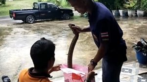 เมื่อเจ้าหน้าที่ไปถึงก็รีบเข้าไปสำรวจที่แกลลอนใส่น้ำภายในห้องน้ำทันที ก็พบว่าเป็นงูจงอางตัวใหญ่ขดตัวอยู่ข้างแกลลอน จึงรีบนำเครื่องมือในการจับงูเข้าทำการจับทันที โดบใช้เวลาประมาณ 3 นาที ก็สามารถจับงูจงอางไว้ได้ นำมาวัดได้ความยาว 3.10 เมตร จึงรีบนำใส่กระสอบ เพื่อเตรียมนำไปปล่อยคืนสู่ป่าธรรมชาติที่อยู่ห่างไกลบ้านเรือนผู้คนเพื่อความปลอดภัยต่อไป
