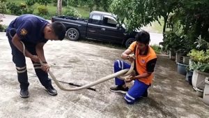 วันนี้ 9 กันยายน 2567 กู้ชีพ อบต.สะท้อน, กู้ชีพ อบต.ท่าประดู่ และนายทวีศักดิ์ บุญเศษ เจ้าหน้าที่ทีมอสรพิษวิทยา ภาคใต้ ได้รับการประสานจากนายไพฑูรย์ หมัดเด็น อายุ 71 ปี บ้านเลขที่ 28 บ้านซองใต้ ม.8 ต.นาทวี อ.นาทวี จ.สงขลา ว่ามีงูจงอางหนีอากาศร้อนเลื้อยเข้าไปซุกอยู่ในห้องน้ำ ที่หลังบ้าน หลังนายทวีศักดิ์ ฯ ได้รับการประสานจึงพร้อมด้วย กู้ชีพ อบต.สะท้อน , กู้ชีพ อบต.ท่าประดู่ และนาย อภิชาติ พรหมสงค์ รีบนำอุปกรณ์ในการจับสัตว์เลื้อยคลาน รุดเข้าตรวจสอบ