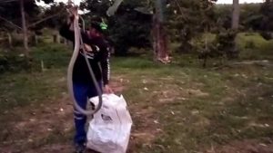 หลังจากที่นายทวีศักดิ์ ฯ ได้รับแจ้งจึงพร้อมด้วยเจ้าหน้าที่กู้ชีพ อบต.สะท้อน รีบนำอุปกรณ์ในการจับสัตว์เลื้อยคลานรุดเข้าตรวจสอบยังบ้านเลขที่ดังกล่าว เมื่อเจ้าหน้าที่ทีมอสรพิษฯไปถึงพบว่าเป็นหางงูจงอาง และจงอางกำลังกลืนกินงูเห่าอยู่ จึงปล่อยให้งูจงอางกินงูเห่าให้เสร็จก่อน จึงจะลงมือเข้าทำการจับงูจงอาง หลังจากที่งูจงอางกินงูเห่าเสร็จ นายทวีศักดิ์ ฯ เจ้าหน้าที่ทีมอสรพิษฯก็ได้เข้าทำการจับงูจงอางทันที โดยใช้เวลานานประมาณ 6 นาที ก็สามารถจับงูจงอางไว้ได้นำมาวัดได้ความยาวประมาณ 2.30 เมตร จึงนำใส่กระสอบเพื่อเตรียมนำไปปล่อยคืนสู่ป่าธรรมชาติที่อยู่ห่างไกลบ้านเรือนผู้คนต่อไปเพื่อความปลอดภัย
