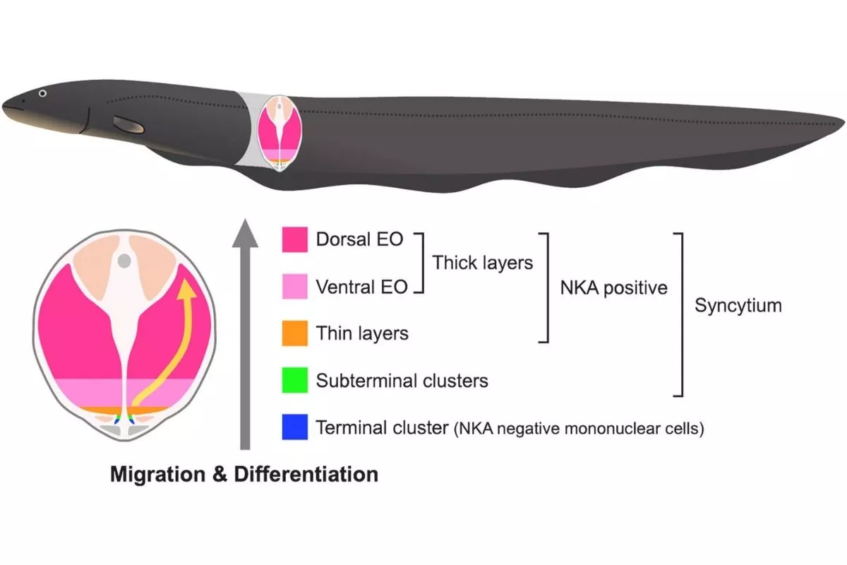 โดยทั่วไป นักวิทยาศาสตร์รู้จักโครงสร้างของเซลล์ไฟฟ้า (electrocyte) ในปลาไหลไฟฟ้ามานาน ว่าคล้ายแบตเตอรี่ที่เรียงกันในรูปแบบเดียวกับการต่อไฟฟ้าแบบอนุกรม แต่ยังไม่มีใครเข้าใจว่าเซลล์เหล่านี้ “สร้างขึ้นมาอย่างไร” งานวิจัยนี้ได้ค้นพบกลุ่มเซลล์ที่ยังไม่พัฒนาเต็มที่ (เรียกว่า progenitor cell) บริเวณปลายล่างของอวัยวะไฟฟ้า ซึ่งยังไม่มีโปรตีนที่ใช้สร้างไฟฟ้าอยู่ภายในเซลล์ นักวิจัยสามารถติดตามการเปลี่ยนแปลงของเซลล์เหล่านี้จนกลายเป็นเซลล์ไฟฟ้าที่มีความสามารถในการปล่อยกระแสได้