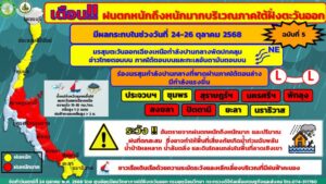 ผู้สื่อข่าวรายงานว่า ศูนย์อุตุนิยมวิทยาภาคใต้ฝั่งตะวันออก ได้ออกประกาศฉบับที่ 5 (56/2568) เรื่อง ฝนตกหนักถึงหนักมากบริเวณภาคใต้ฝั่งตะวันออก (มีผลกระทบในช่วงวันที่ 24-26 ตุลาคม 2568) หลังร่องมรสุมมีกำลังแรงขึ้น และมรสุมตะวันออกเฉียงเหนือพัดปกคลุมอ่าวไทย