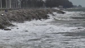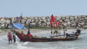 นายชามิล ชาวประมงอวนปู วัย 33 ปี พร้อมเพื่อนอีก 2 คน ได้เสี่ยงนำเรือฝ่าคลื่นลมแรงออกไปเก็บอวนปู 50 ผืน ความยาว 3.5 กิโลเมตร หวิดถูกคลื่นซัดเรือจม หลังกลับเข้าฝั่งยังประสบปัญหาเครื่องกว้านขัดข้อง จนต้องระดมเพื่อนชาวประมงกว่า 10 คน มาช่วยกันลากเรือขึ้นไปเก็บในระยะปลอดภัย