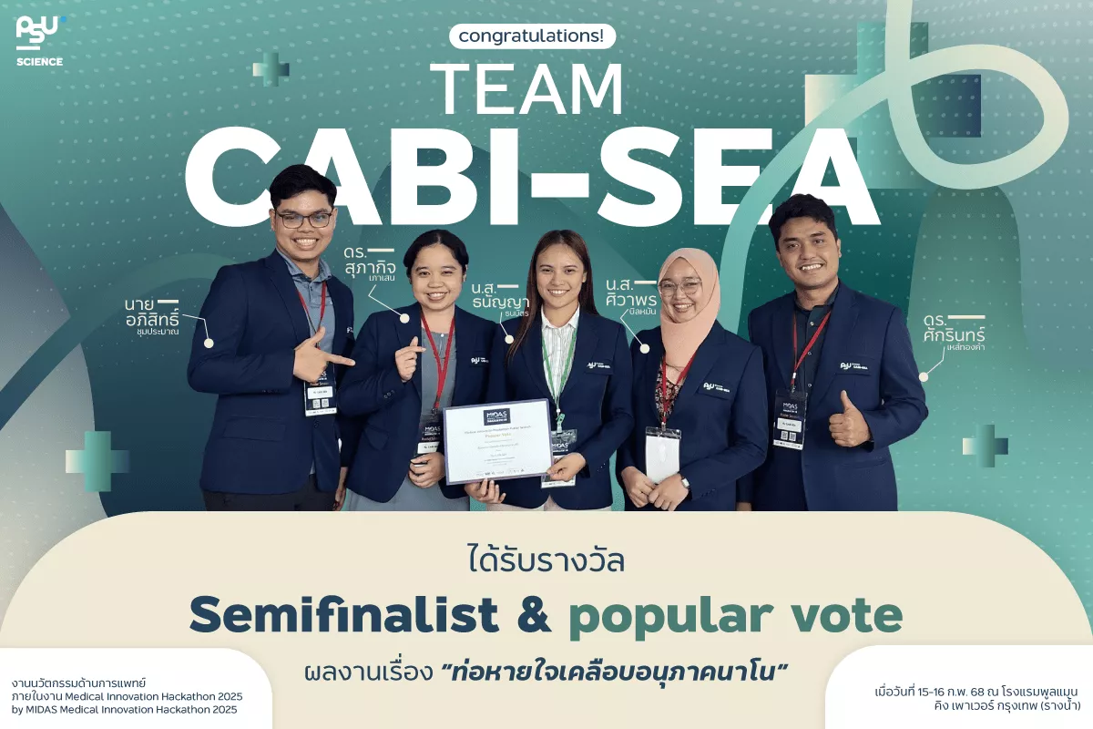 คณะวิทยาศาสตร์ มหาวิทยาลัยสงขลานครินทร์ ขอแสดงความยินดีกับทีม CABI-SEA ซึ่งประกอบด้วย ดร.ศักรินทร์ เหล่ทองคำ, ดร.สุภากิจ เภาเสน, นายอภิสิทธิ์ ชุมประมาณ, น.ส.ศิวาพร บิลหมัน และ น.ส.ธนัญญา ธนบัตร ที่ได้รับรางวัล Semifinalist และ Popular Vote จากผลงานเรื่อง “ท่อหายใจเคลือบอนุภาคนาโน” ในงานนวัตกรรมด้านการแพทย์ Medical Innovation Hackathon 2025 by MIDAS ซึ่งจัดขึ้นเมื่อวันที่ 15-16 กุมภาพันธ์ พ.ศ. 2568 ณ โรงแรมพูลแมน คิง เพาเวอร์ กรุงเทพ (รางน้ำ)