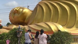 นักท่องเที่ยวชาวไทยกราบไหว้พระนอนปางปรินิพพานองค์ใหญ่ที่สุดในประเทศไทย
