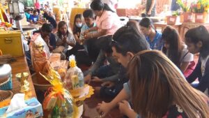 หลังจากกราบไหว้พระนอนปางปรินิพพานองค์ใหญ่ที่สุดในประเทศไทยแล้ว ก็จะเข้ามาทำบุญถวายสังฆทานพระสงฆ์ สร้างกุศลเสริมบุญในปีใหม่ 2569 เพื่อความเป็นสิริมงคลแก่ตนเองและครอบครัว โดยทางวัดได้จัดเตรียมชุดสังฆทานที่ถวายพระสงฆ์ รวมทั้งดอกไม้ธูปเทียนไว้ให้พร้อม และจัดพระสงฆ์มารับถวายสังฆทานจากญาติโยมตลอดเวลาทั้งวันหมุนเวียนกันไป เพื่อให้ผู้ที่ตั้งใจเดินทางมาถวายสังฆทานได้รับความสะดวกและรวดเร็ว สร้างความประทับใจให้กับนักท่องเที่ยวที่เดินทางมาท่องเที่ยวที่วัดพระนอนวัดแหลมพ้อ เพื่อจะได้กลับมาท่องเที่ยวอีกครั้งหนึ่งเนื่องจากวัดพระนอนวัดแหลมพ้อเกาะยอ เป็นแหล่งท่องเที่ยวที่ได้รับความสนใจจากนักท่องเที่ยวทั้งชาวไทยและชาวต่างชาติ เป็นแหล่งท่องเที่ยวเชิงธรรมชาติอีกแห่งหนึ่งของจังหวัดสงขลา ที่มีนักท่องเที่ยวและชาวสงขลาเข้ามากราบไหว้ขอพรและถวายสังฆทานทุกวัน
