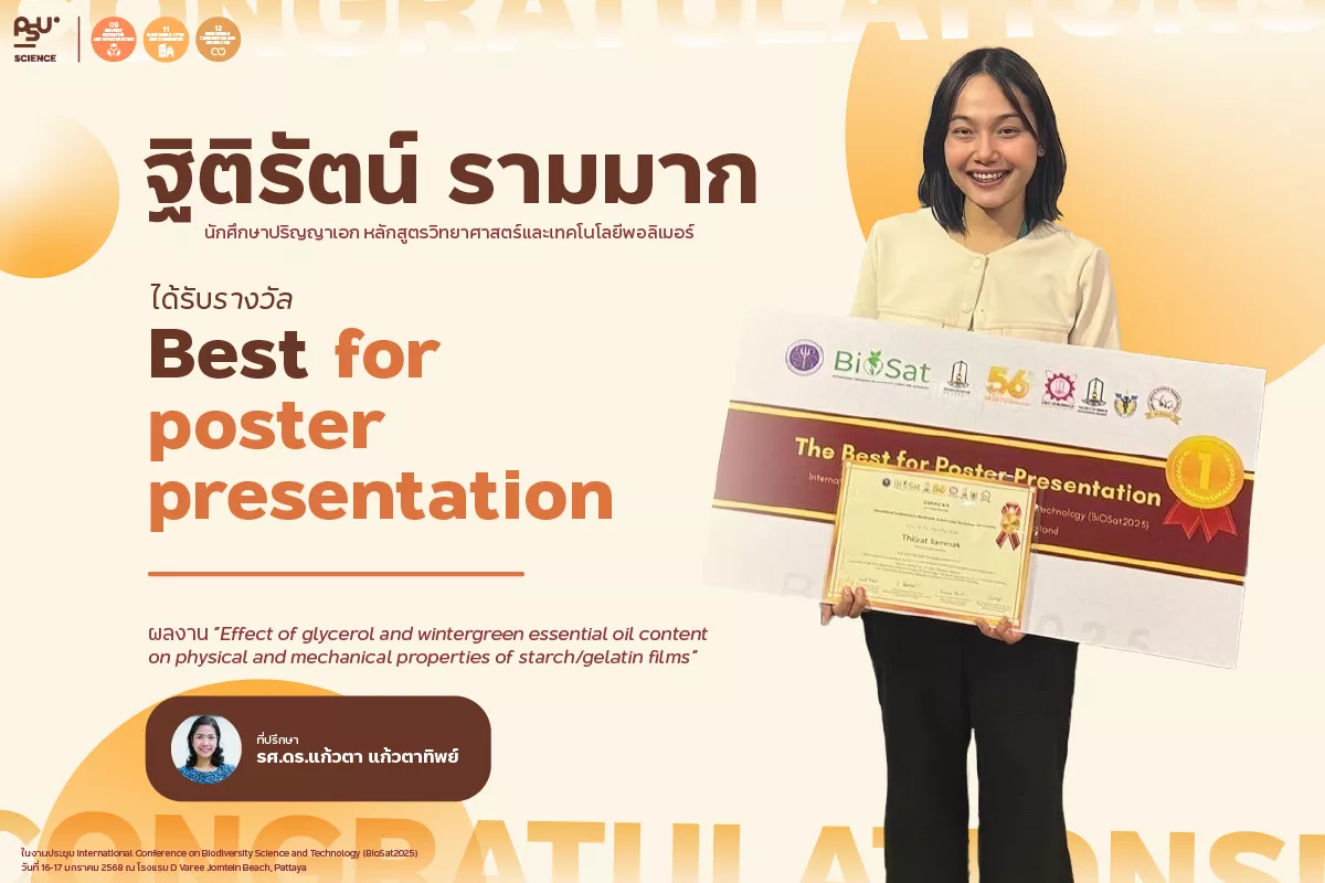 คณะวิทยาศาสตร์ มหาวิทยาลัยสงขลานครินทร์ ขอแสดงความยินดีกับ นางสาวฐิติรัตน์ รามมาก นักศึกษาปริญญาเอก สาขาวิทยาศาสตร์และเทคโนโลยีพอลิเมอร์ ที่ได้รับรางวัล Best for poster presentation จากผลงานวิจัยเรื่อง