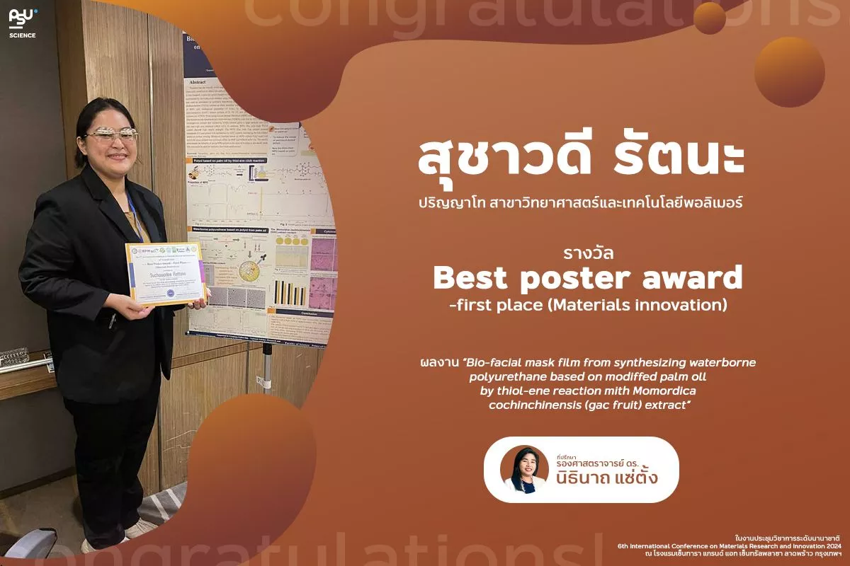 คณะวิทยาศาสตร์ มหาวิทยาลัยสงขลานครินทร์ ขอแสดงความยินดีกับ นางสาวสุชาวดี รัตนะ นักศึกษาปริญญาโท สาขาวิทยาศาสตร์กายภาพ หลักสูตรวิทยาศาสตร์และเทคโนโลยีพอลิเมอร์ ที่ได้รับรางวัล Best poster award-first place (Materials innovation) จากผลงานวิจัยเรื่อง “Bio-facial mask film from synthesizing waterborne polyurethane based on modiffed palm oll by thiol-ene reaction mith Momordica cochinchinensis (gac fruit) extract” ในงานประชุมวิชาการระดับนานาชาติ 6th International Conference on Materials Research and Innovation 2024 (ICMARI 2024) ณ โรงแรมเซ็นทารา แกรนด์ แอท เซ็นทรัลพลาซา ลาดพร้าว กรุงเทพฯ โดยมี รองศาสตราจารย์ ดร.นิธินาถ แซ่ตั้ง เป็นอาจารย์ที่ปรึกษา