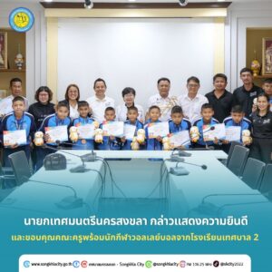 วันนี้ (6 กุมภาพันธ์ 2569) ณ ห้องประชุมสารภี 1 สำนักงานเทศบาลนครสงขลา นายวันชัย ปริญญาศิริ นายกเทศมนตรีนครสงขลา กล่าวแสดงความยินดีและขอบคุณคณะครูพร้อมนักกีฬาวอลเลย์บอลจากโรงเรียนเทศบาล 2 (อ่อนอุทิศ) ที่สร้างชื่อเสียงคว้า รางวัลรองชนะเลิศอันดับสอง ประเภททีมชาย รุ่นอายุ 12 ปี ในการแข่งขันกีฬานักเรียนองค์กรปกครองส่วนท้องถิ่นแห่งประเทศไทย รอบชิงชนะเลิศระดับประเทศ ครั้งที่ 40 “ศรีสะเกษเกมส์” เมื่อปลายเดือนมกราคมที่ผ่านมา