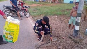เมื่อวันที่ 16 ธ.ค. 67 นายทวีศักดิ์ บุญเศษ เจ้าหน้าที่ทีมอสรพิษวิทยา ภาคใต้ กำลังออกปฏิบัติหน้าที่อยู่ในพื้นที่ อ.นาทวี จ.สงขลา ก็ได้รับการประสานจากนายศรัณญ์ ทองวิไล อายุ 65 ปี อยู่บ้านเลขที่ 23/1 หมู่ 8 ต.สะท้อน อ.นาทวี จ.สงขลา ว่ามีงูจงอางมากินงูเห่าอยู่หน้าบ้าน ขอให้ทีมอสรพิษฯ ช่วยมาจับงูจงอางให้ที