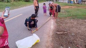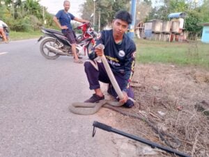 เมื่อวันที่ 16 ธ.ค. 67 นายทวีศักดิ์ บุญเศษ เจ้าหน้าที่ทีมอสรพิษวิทยา ภาคใต้ กำลังออกปฏิบัติหน้าที่อยู่ในพื้นที่ อ.นาทวี จ.สงขลา ก็ได้รับการประสานจากนายศรัณญ์ ทองวิไล อายุ 65 ปี อยู่บ้านเลขที่ 23/1 หมู่ 8 ต.สะท้อน อ.นาทวี จ.สงขลา ว่ามีงูจงอางมากินงูเห่าอยู่หน้าบ้าน ขอให้ทีมอสรพิษฯ ช่วยมาจับงูจงอางให้ที