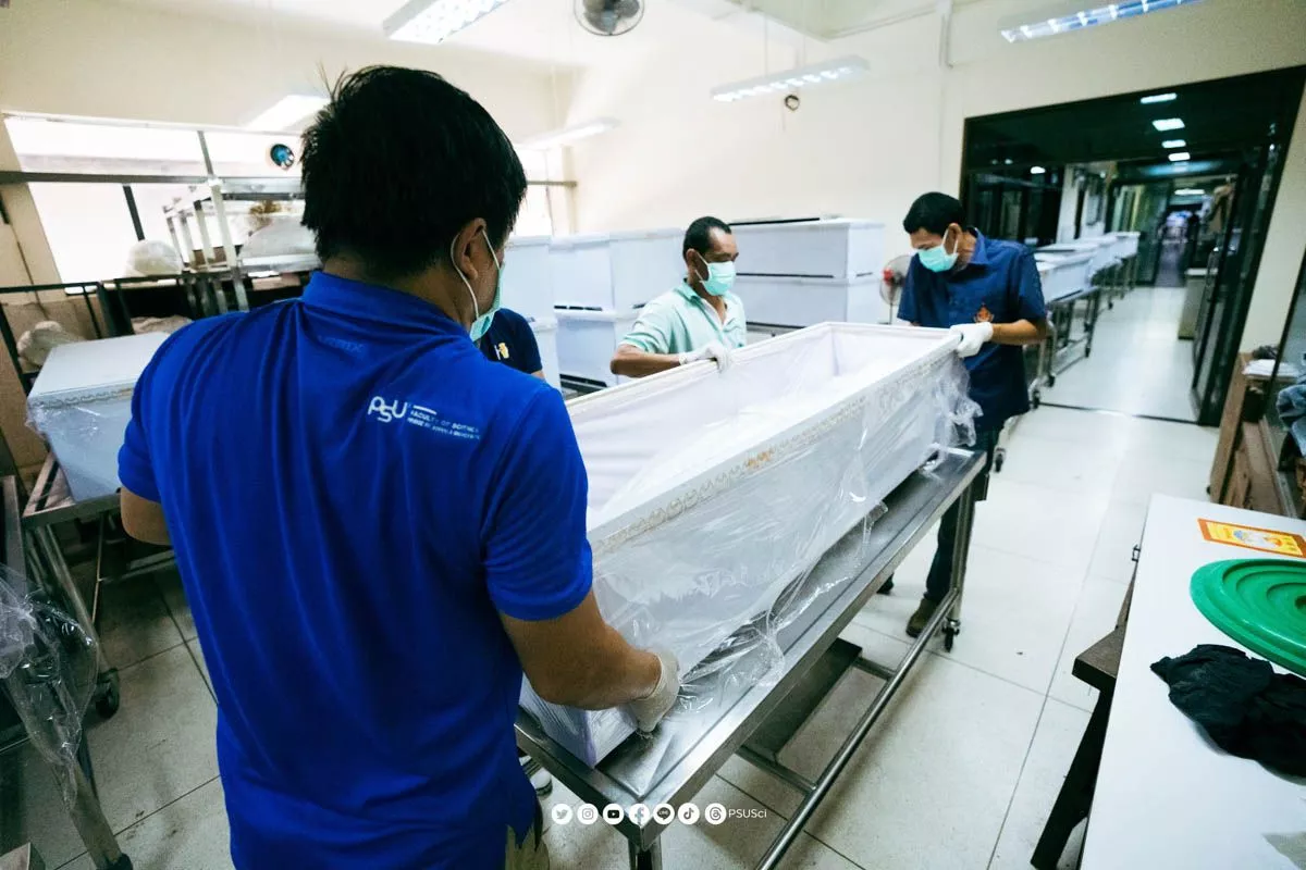 บุคลากรคณะวิทยาศาสตร์ ม.อ. ทำการบรรจุร่างอาจารย์ใหญ่เข้าโลงศพ เตรียมพร้อมพิธีพระราชทานเพลิงศพ (เป็นกรณีพิเศษ) ประจำปี 2567