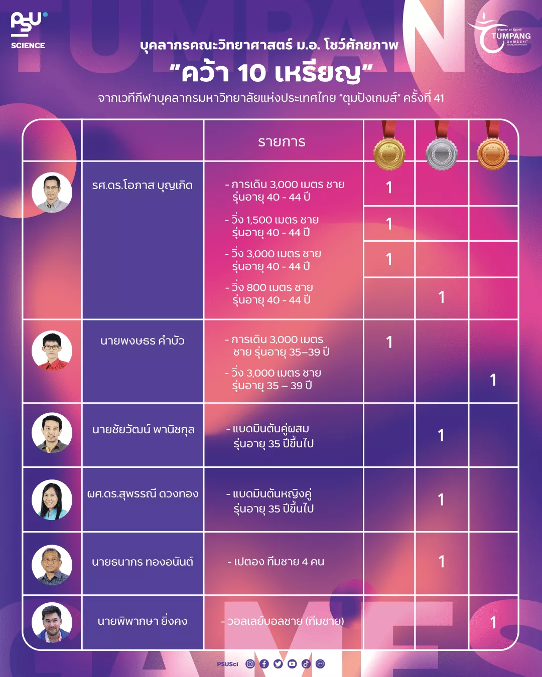 คณะวิทยาศาสตร์ มหาวิทยาลัยสงขลานครินทร์ สร้างความภาคภูมิใจอย่างต่อเนื่องในการแข่งขัน กีฬาบุคลากรมหาวิทยาลัยแห่งประเทศไทย ครั้งที่ 41 ตุมปังเกมส์ ซึ่งจัดขึ้นระหว่างวันที่ 5–11 พฤษภาคม 2568 ณ มหาวิทยาลัยวลัยลักษณ์ จังหวัดนครศรีธรรมราช โดยสามารถคว้ารวม 10 เหรียญรางวัล จากหลากหลายประเภทกีฬา ทั้งแบดมินตัน เปตอง วอลเลย์บอล และกรีฑา