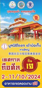 ขอเชิญชวนนักบุญทุกท่าน ร่วมพิธีอันเป็นมงคลในช่วงงานเทศกาลถือศีลกินเจ ที่ทางมูลนิธิโรงเจเต๋าบ้อเก็ง หาดใหญ่
