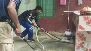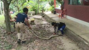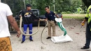 หลังจากที่ทีมอสรพิษวิทยาภาคใต้ได้รับการประสาน นายทวีศักดิ์ บุญเศษ ทีมอสรพิษวิทยาฯพร้อมด้วยนาย ไกรวิชญ์ อ่อนมนิล ทีมอสรพิษวิทยาฯและกู้ชีพ อบต.ฯจึงรีบนำอุปกรณ์ในการจับสัตว์เลื้อยคลานรุดเข้าตรวจสอบยังบ้านเลขที่ดังกล่าว เมื่อไปถึง จึงได้เข้าตรวจสอบที่บริเวณใต้ซิงค์ล้างจานพบว่าเป็นงูจงอางยักษ์เลื้อยเข้าไปซุกซ่อนในนั้น จึงนำอุปกรณ์ในการจับงูเข้าทำการจับงูจงอางยักษ์ทันที ในขณะเข้าจับงูจงอางชูคอสู้อย่างดุร้าย เจ้าหน้าที่ต้องใช้เวลาในการจับงูจงอางยักษ์นานประมาณ 5 นาที จึงสามารถจับงูจงอางยักษ์ไว้ได้ นำงูมาวัดได้ความยาวถึง 4 เมตร จึงจับใส่กระสอบปุ๋ยไว้