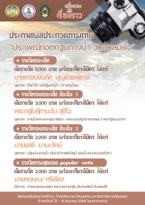 ทั้งนี้ผู้ได้รับรางวัลสามารถติดต่อขอรับเงินรางวัลและเกียรติบัตรได้ที่สำนักศิลปะและวัฒนธรรม มหาวิทยาลัยราชภัฏสงขลา ได้ตั้งแต่วันที่ 12 – 15 ธันวาคม 2566 ในเวลาราชการ