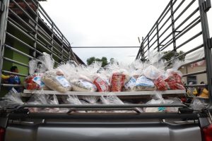 โอกาสนี้ นายเฉลิมชัย ศรีอ่อน รัฐมนตรีว่าการกระทรวงทรัพยากรธรรมชาติและสิ่งแวดล้อม ได้พบปะพูดคุยกับชาวบ้านที่ได้รับผลกระทบ พร้อมมอบถุงยังชีพและสิ่งของจำเป็นแก่ประชาชน เพื่อบรรเทาความเดือดร้อนในเบื้องต้น ก่อนปล่อยขบวนคาราวานถุงยังชีพ เพื่อนำแจกจ่ายพี่น้องประชาชนในพื้นที่ประสบภัยในพื้นที่อำเภอจะนะ จังหวัดสงขลา ซึ่งประชาชนได้รับความเดือดร้อนครอบคลุมทั้ง 14 ตำบล 134 หมู่บ้าน ส่งผลกระทบต่อประชาชน 26,220 ครัวเรือน มีผู้เสียชีวิต 1 ราย และบ้านเสียหายทั้งหลัง 3 หลัง ปัจจุบันยังคงมีน้ำท่วมขังใน 1 ตำบล 1 หมู่บ้าน ส่งผลกระทบต่อ 6 ครัวเรือน รวม 23 คน