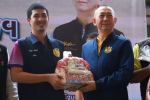 โอกาสนี้ นายเฉลิมชัย ศรีอ่อน รัฐมนตรีว่าการกระทรวงทรัพยากรธรรมชาติและสิ่งแวดล้อม ได้พบปะพูดคุยกับชาวบ้านที่ได้รับผลกระทบ พร้อมมอบถุงยังชีพและสิ่งของจำเป็นแก่ประชาชน เพื่อบรรเทาความเดือดร้อนในเบื้องต้น ก่อนปล่อยขบวนคาราวานถุงยังชีพ เพื่อนำแจกจ่ายพี่น้องประชาชนในพื้นที่ประสบภัยในพื้นที่อำเภอจะนะ จังหวัดสงขลา ซึ่งประชาชนได้รับความเดือดร้อนครอบคลุมทั้ง 14 ตำบล 134 หมู่บ้าน ส่งผลกระทบต่อประชาชน 26,220 ครัวเรือน มีผู้เสียชีวิต 1 ราย และบ้านเสียหายทั้งหลัง 3 หลัง ปัจจุบันยังคงมีน้ำท่วมขังใน 1 ตำบล 1 หมู่บ้าน ส่งผลกระทบต่อ 6 ครัวเรือน รวม 23 คน