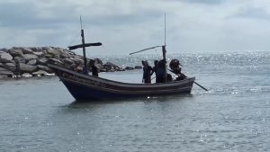 ปูม้าราคาดี เรือประมงพื้นบ้านออกเรือไปเก็บอวนปูกลางทะเล แม้ว่าเริ่มมีคลื่นแล้วก็ตาม