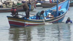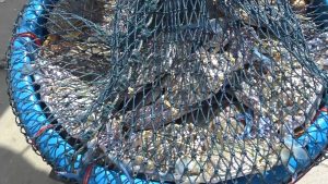 นายเฉด หมีดเจริญ ชาวประมงพื้นบ้านอวนปู กล่าวว่า วันนี้คลื่นลมกลางทะเล ยังเงียบสงบอยู่ยังไม่เป็นไร ที่อุตุประกาศเตือนวันนี้คลื่นแรงก็นิดหน่อย แต่วันนี้ยังไม่เป็น แต่ก็เริ่มแล้วเริ่มนิดๆสำหรับวันนี้การจับสัตว์น้ำได้น้อยโดยเฉพาะปูม้า เนื่องจากปูม้าจะชุกชุมในช่วงที่มีคลื่นลมแรง ตอนนี้ก็รอคลื่นอยู่ ถ้าไม่มีคลื่นก็จะไม่มีปู เพราะฉะนั้นต้องมีคลื่นจึงจะมีปู หลังคลื่นสงบก็จะได้บ้าง เนื่องจากการทำอวนปูต้องมีคลื่น ส่วนอวนอื่นๆเวลาคลื่นสงบก็ได้ แต่อวนปูต้องมีคลื่น วันนี้ออกไปเก็บปูตั้งแต่ตอนเช้าประมาณ 6:00 น.แล้ววางอวนทิ้งไว้ใหม่เผื่อทะเลจะได้เป็นคลื่นก็จะได้ปูมั่ง