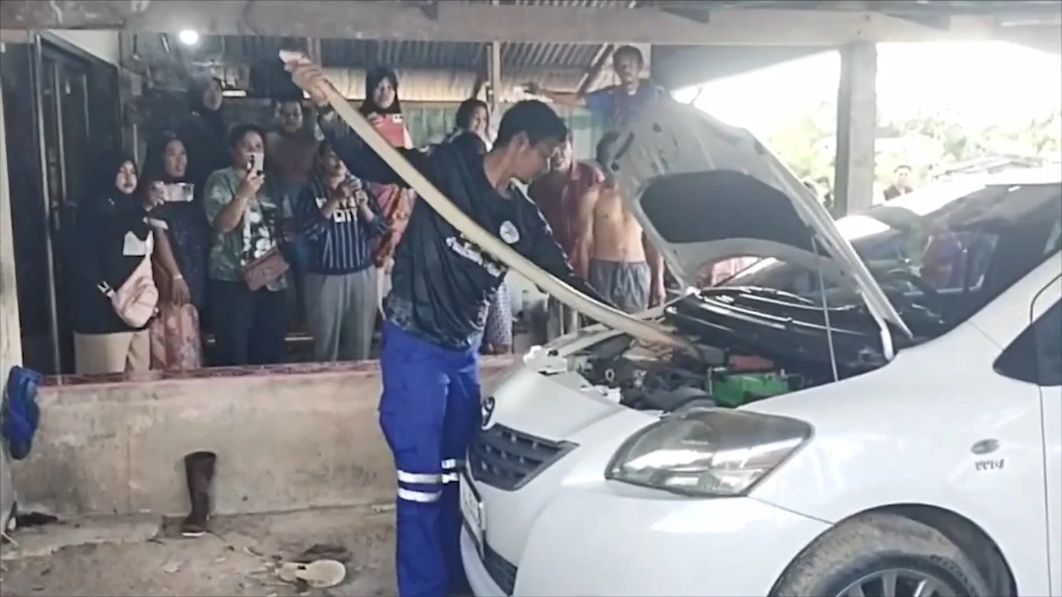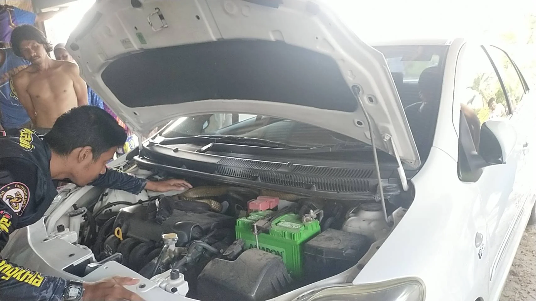 ผงะ! จงอางยักษ์ 3 เมตร มุดซุกห้องเครื่องเก๋ง คอหวยแห่ส่องเลขทะเบียนทันที