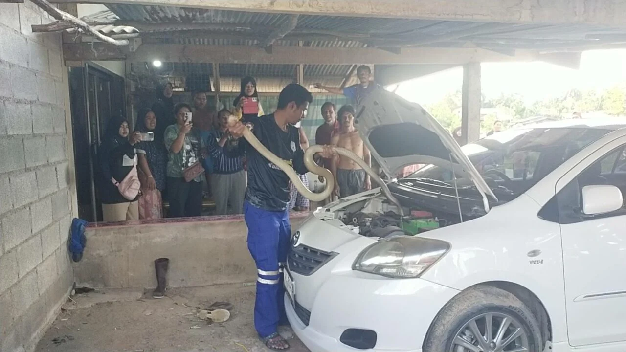 เกิดเหตุสุดระทึกขวัญ เมื่อ “งูจงอางยักษ์” ยาวกว่า 3 เมตร เลื้อยไล่ตามกลุ่มเด็กเล่นว่าว จนต้องวิ่งหนีตายเข้าบ้าน ขณะที่ฝ่ายงูเลื้อยเข้าไปซุกซ่อนในตัวรถเก๋งที่จอดอยู่ จนเจ้าของต้องโทรฯแจ้ง ทีมปราบอสรพิษ อ.นาทวี/อาสาพิทักษ์งู จ.สงขลา มาช่วยจับออกมาได้อย่างปลอดภัย