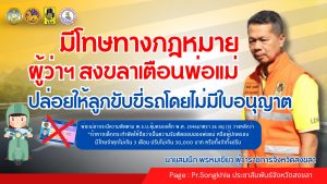 ผู้ว่าฯ สงขลา เตือน “พ่อแม่ปล่อยให้ลูกขับรถโดยไม่มีใบขับขี่ มีโทษทางกฎหมาย ทั้งจำทั้งปรับ