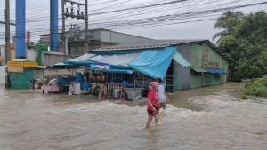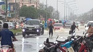 ที่ จ.สงขลา จากฝนที่ตกสะสมต่อเนื่องในช่วงทำให้เกิดน้ำไหลหลากเข้าท่วมแล้วในบางพื้นที่ เช่น ถนนกาญจนวนิช เส้นทางหาดใหญ่-สงขลา สายเก่า ตั้งแต่ช่วงเช้าของวันนี้ฯนำจากเขาหลงได้ไหลลงมาท่วมถนนในพื้นที่บ้านควนหิน เขตเทศบาลตำบลพะวง อ.เมืองสงขลา และท่วมทั้งสองฝั่งระดับน้ำค่อนข้างสูงรถเล็กผ่านลำบาก และทำให้การจราจรทั้งขาเข้าสงขลาและขาไปหาดใหญ่ติดขัด