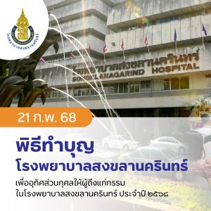 วันศุกร์ที่ 21 กุมภาพันธ์ พ.ศ. 2568 รศ.นพ.รังสรรค์ ภูรยานนทชัย รองคณบดีฝ่ายโรงพยาบาลและผู้อำนวยการโรงพยาบาลสงขลานครินทร์ รักษาการแทนคณบดีคณะแพทยศาสตร์ พร้อมด้วยกรรมการมูลนิธิโรงพยาบาบาลสงขลานครินทร์ ผู้บริหาร คณะแพทยศาสตร์ บุคลากร ตลอดจนผู้ป่วยและญาติ ร่วมพิธีทำบุญโรงพยาบาลประจำปี 2568 ซึ่งเป็นกิจกรรม ที่จัดขึ้นเป็นประจำทุกปี เพื่อความเป็นศิริมงคลแก่บุคลากร และอุทิศส่วนกุศลให้กับผู้ที่เสียชีวิตในโรงพยาบาล โดยพิธีเริ่มต้นตั้งแต่เวลา 06.09 สักการะพระภูมิเจ้าที่ หลังจากนั้นสักการะพระบรมราชานุสาวรีย์ สมเด็จพระมหิตลาธิเบศร อดุลยเดชวิกรม พระบรมราชชนก และสักการะพระพุทธรูป ณ วิหารหลวงปู่ทวด