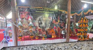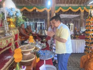 พิธีทำบุญ ถวายภัตตาหารแด่พระภิกษุสงฆ์ เนื่องในงานทำบุญเดือน 5 ห่มผ้าพระนอน ปิดทองหัวใจองค์พระ