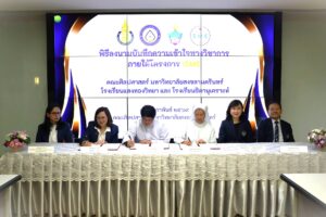 ในโอกาสนี้ ผู้บริหารจากทั้งสามฝ่ายได้ร่วมลงนามในบันทึกข้อตกลงความร่วมมือ โดยได้รับเกียรติจาก ดร.พนิดา สุขศรีเมือง คณบดีคณะศิลปศาสตร์ ลงนามในนามฝ่ายมหาวิทยาลัยสงขลานครินทร์ บาทหลวงรณชัย มัทวพันธุ์ ผู้อำนวยการโรงเรียนแสงทองวิทยา ลงนามในนามฝ่ายโรงเรียนแสงทองวิทยา และซิสเตอร์ศรีสุดา สุทธิรัตนากร ผู้อำนวยการโรงเรียนธิดานุเคราะห์ ลงนามในนามฝ่ายโรงเรียนธิดานุเคราะห์