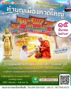 พิธีสวดบ้านแปลงเมือง”งานทำบุญเมืองหาดใหญ่” ข่าวด่วน 14 มี.ค. 2026 6 share tweet share พิธีสวดบ้านแปลงเมือง ในเสาร์ที่ 14 มีนาคม พ.ศ.2569 เวลา 17.00 น. เป็นต้นไป “งานทำบุญเมืองหาดใหญ่” ตักบาตรพระ 1,109 รูป ในวันอาทิตย์ที่ 15 มีนาคม พ.ศ.2569 เวลา 06.00 น. ณ บริเวณซุ้มประตูไชน่าทาวน์ ถ.ศุภสารรังสรรค์ FacebookFacebookLINELine