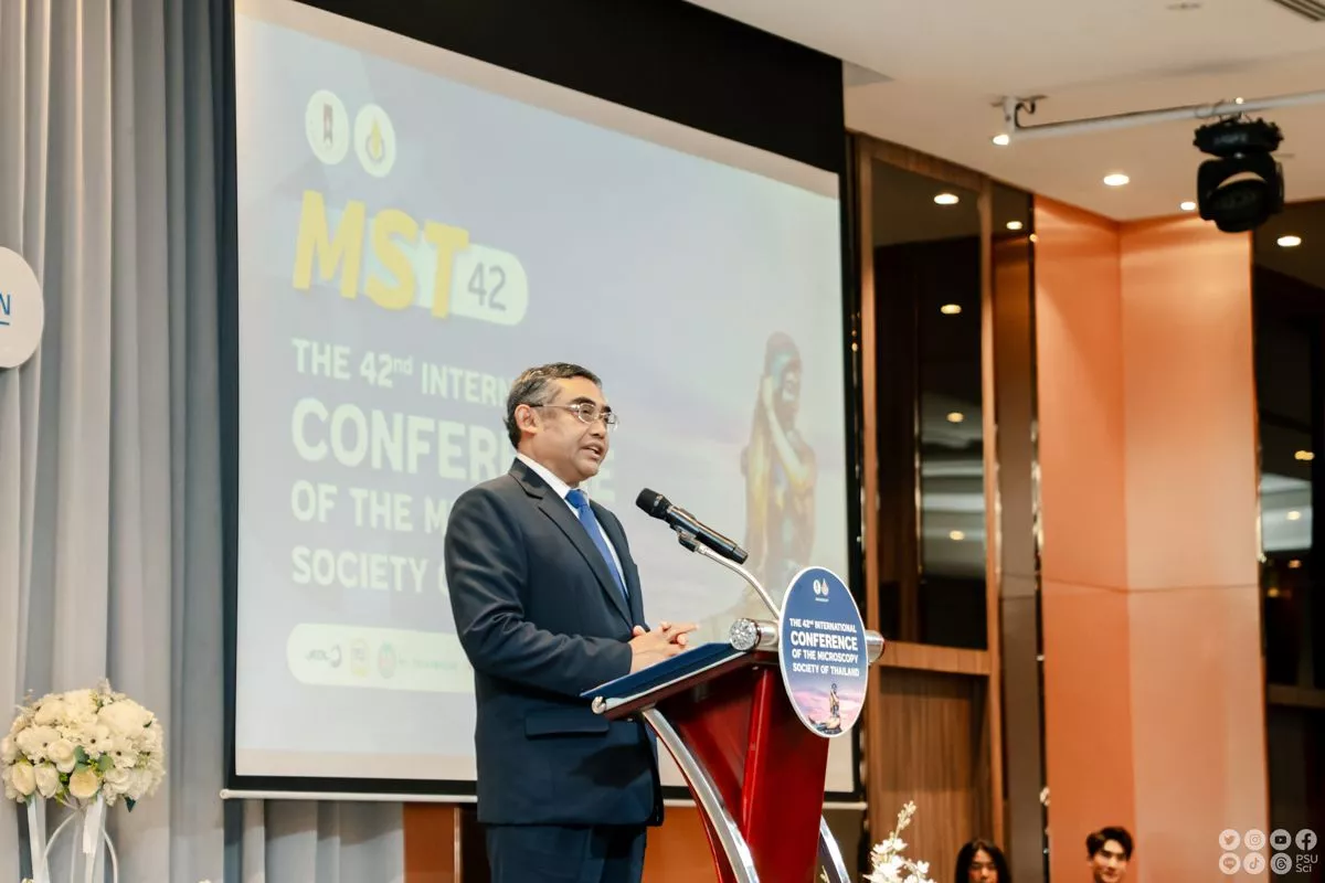 เมื่อวันที่ 10 มิถุนายน 2568 ณ โรงแรมลากูน่า แกรนด์ แอนด์ สปา จังหวัดสงขลา การประชุมวิชาการนานาชาติครั้งที่ 42 ของสมาคมจุลทรรศน์แห่งประเทศไทย หรือ MST42 (The 42nd International Conference of the Microscopy Society of Thailand) ได้เปิดฉากอย่างเป็นทางการในบรรยากาศคึกคัก ท่ามกลางการรวมตัวของนักวิจัย นักวิทยาศาสตร์ และภาคอุตสาหกรรมจากทั้งในและต่างประเทศ ภายใต้ธีมหลักที่ทรงพลัง “Seeing the Invisible: How Microscopy Transforms Science and Industry” ซึ่งสะท้อนให้เห็นถึงบทบาทสำคัญของวิทยาการด้านจุลทรรศน์ในการพลิกโฉมโลกของวิทยาศาสตร์ เทคโนโลยี และอุตสาหกรรมในยุคที่การมองเห็นในระดับนาโนมีความหมายต่อคุณภาพชีวิตของมนุษยชาติอย่างแท้จริง