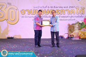 วันอาทิตย์ที่ 11 สิงหาคม 2567 นายทวีศักดิ์ ทวีรัตน์ นายกเทศมนตรีเมืองคอหงส์ พร้อมด้วย นางมัทนา ชินอณาฉายอรุณ ประธานกลุ่มพัฒนาสตรีเทศบาลเมืองคอหงส์ ร่วมพิธีเปิด และรับมอบใบประกาศเกียรติคุณผู้สนับสนุนการจัดงานเกษตรภาคใต้ครั้งที่ 30 ซึ่งจัดโดยคณะทรัพยากรธรรมชาติ มหาวิทยาลัยสงขลานครินทร์ จากนายอาดิลัน อาลีอิสเฮาะ ที่ปรึกษารัฐมนตรีช่วยว่าการกระทรวงเกษตรและสหกรณ์ ประธานในพิธี ณ งานเกษตรภาคใต้ ครั้งที่ 30 มหาวิทยาลัยสงขลานครินทร์