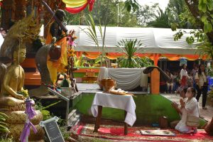 กิจกรรมเริ่มด้วยการเเสดงระบำเทพบันเทิง, การร่ายรำของกลุ่มเเม่บ้าน จากนั้นเวลา 09.00 น. นายเศวต เพชรนุ้ย รองผู้ว่าราชการจังหวัดสงขลา ประธานในพิธีนำจุดธูปเทียนหน้าโต๊ะบวงสรวง เริ่มพิธีพราหมณ์บวงสรวงบูชาฤกษ์ บัณฑิตพราหมณ์นำสวดอัญเชิญเทวดา, รองผู้ว่าราชการจังหวัดนำปักธูปหางบนเครื่องบายศรี เครื่องบูชา ก่อนจะเริ่มพิธีสงฆ์ ประธานจุดธูปเทียนหน้าโต๊ะหมู่บูชา พระสงฆ์สวดสมโภชผ้าพระบฏต้นเลียบ และสมโภชแผ่นศิลาฤกษ์พระอุโบสถที่กำลังดำเนินการก่อสร้าง