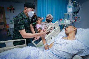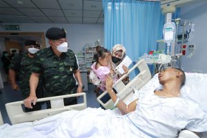 วันนี้ 12 มิถุนายน 2566 เวลา 13.30 น. ณ โรงพยาบาลสงขลานครินทร์ อำเภอหาดใหญ่ จังหวัดสงขลา พลโท ศานติ ศกุนตนาค แม่ทัพภาคที่ 4/ ผู้อำนวยการรักษาความมั่นคงภายในภาค 4 เยี่ยมให้กำลังใจ อส.ทพ.อาสือรี บูงอตันหยง กำลังพล หน่วยเฉพาะกิจกรมทหารพรานที่ 48 ซึ่งได้รับบาดเจ็บจากเหตุร้ายรอบวางระเบิด ชุดปฏิบัติการพิทักษ์พื้นที่ กองร้อยทหารพรานที่ 4812 ขณะลาดตระเวนเส้นทาง บริเวณบ้านปาเร๊ะลูโป๊ะ หมู่ 9 ตำบลมะรือโบออก อำเภอเจาะไอร้อง จังหวัดนราธิวาส เมื่อวันที่ 10 มิถุนายน 2566 ที่ผ่านมา แรงระเบิดทำให้ อส.ทพ.อาสือรี บูงอตันหยง ได้รับบาดเจ็บสาหัสบริเวณขาทั้งสองข้าง นำส่งโรงพยาบาลเจาะไอร้อง จังหวัดนราธิวาส ต่อมาได้ส่งต่อการรักษา ทางเฮลิคอปเตอร์มายังโรงพยาบาลสงขลานครินทร์ จังหวัดสงขลา เพื่อให้ทีมแพทย์ทำการรักษา โดยได้ทำการผ่าตัดขาเหนือเข่าทั้งสองข้าง เนื่องจากมีอาการบาดเจ็บรุนแรง กระดูกและเนื้อเยื่อได้รับความเสียหายอย่างหนัก ขณะนี้ รู้สึกตัวดี และอยู่ในความดูแลของแพทย์อย่างใกล้ชิด