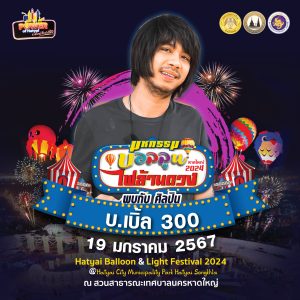 มหกรรมบอลลูนหาดใหญ่ -ไฟล้านดวง เก็บความประทับใจได้ฟรี! ไม่มีค่าใช้จ่าย ข่าวด่วน 12 ม.ค. 2024 129 share tweet share ตั้งแต่วันที่ 11-22 มกราคม 2567 เวลา 18.00 น. เป็นต้นไป ณ สวนสาธารณะเทศบาลนครหาดใหญ่ อำเภอหาดใหญ่ จังหวัดสงขลา พบแสงไฟจากบอลลูนยักษ์ และความสวยงามของแสงไฟยามค่ำคืนนับล้านดวง และศิลปินมากมาย