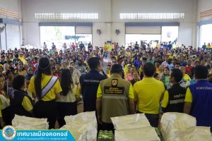 วันที่ 5 ธันวาคม 2567 นายเอก ยังอภัย ณ สงขลา นายอำเภอหาดใหญ่ พร้อมด้วย นางมุกดา ยังอภัย ณ สงขลา ประธานแม่บ้านมหาดไทยอำเภอหาดใหญ่ นางสาวรติยาภรณ์ ชูแก้ว นางสาวไทยจังหวัดสงขลาประจำปี 2568 หัวหน้าส่วนราชการในอำเภอหาดใหญ่ และตัวแทนเหล่ากาชาดจังหวัดสงขลา ลงพื้นที่ชุมชนบ้านคลองหวะ เพื่อมอบชุดธารน้ำใจจากสภากาชาดไทย เพื่อช่วยเหลือผู้ประสบอุทกภัยในเขตเทศบาลเมืองคอหงส์ จำนวน 600 ชุด โดยมีนายทวีศักดิ์ ทวีรัตน์ นายกเทศมนตรีเมืองคอหงส์ กล่าวรายงานสถานการณ์อุทกภัยในพื้นที่ ณ อาคารอเนกประสงค์บ้านคลองหวะ เทศบาลเมืองคอหงส์