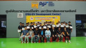 (20 ก.ค.68) ศูนย์พัฒนายานยนต์ไฟฟ้า มหาวิทยาลัยสงขลานครินทร์ ร่วมกับสถาบันพัฒนาฝีมือแรงงาน 12 สงขลา ได้มอบวุฒิบัตรพัฒนาฝีมือแรงงาน ให้นักศึกษา สาขาวิศวกรรมไฟฟ้า ชั้นปีที่ 4 จำนวน 20 คน ที่ผ่านการฝึกอบรม หลักสูตรระบบแบตเตอรี่และระบบประจุไฟฟ้ายานยนต์ไฟฟ้า ในภาคทฤษฎีและภาคปฏิบัติ จำนวน 30 ชั่วโมง ระหว่างวันที่ 6-20 ก.ค. 68 (อบรม เสาร์-อาทิตย์) ได้รับการสนับสนุนงบประมาณจากจังหวัดสงขลา ภายใต้โครงการ สร้างงาน สร้างอาขีพ รองรับโลจิสติกส์ ในพื้นที่พัฒนาเศรษฐกิจพิเศษ ด้านยานยนต์สมัยใหม่ ทั้งนี้ได้รับเกียรติจากผศ.ดร. กุสุมาลย์ เฉลิมยานนท์ อาจารย์สาขาวิชาวิศวกรรมไฟฟ้า และ นายอำนาจ รักนิ่ม หัวหน้าฝ่ายส่งเสริมการพัฒนาฝีมือแรงงาน สถาบันพัฒนาฝีมือแรงแรงงาน 12 สงขลา เข้าร่วมแสดงความยินดีกับนักศึกษาในพิธีมอบวุฒิบัตร
