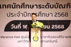 มหาวิทยาลัยสงขลานครินทร์ จัดปฐมนิเทศนักศึกษาบัณฑิตศึกษา ประจำปีการศึกษา 2568 โดย ผู้ช่วยศาสตราจารย์ ดร.เถกิง วงศ์ศิริโชติ รองอธิการบดีฝ่ายวิชาการและวิเทศสัมพันธ์ มหาวิทยาลัยสงขลานครินทร์ กล่าวให้โอวาทและต้อนรับนักศึกษาใหม่ พร้อมด้วย คณะผู้บริหาร บุคลากร และนักศึกษา เข้าร่วมอย่างคับคั่ง ณ ห้องประชุม Conference Hall ศูนย์ประชุมนานาชาติฉลองสิริราชสมบัติครบ 60 ปี มหาวิทยาลัยสงขลานครินทร์ วิทยาเขตหาดใหญ่ เมื่อวันที่ 16 มิถุนายน 2568