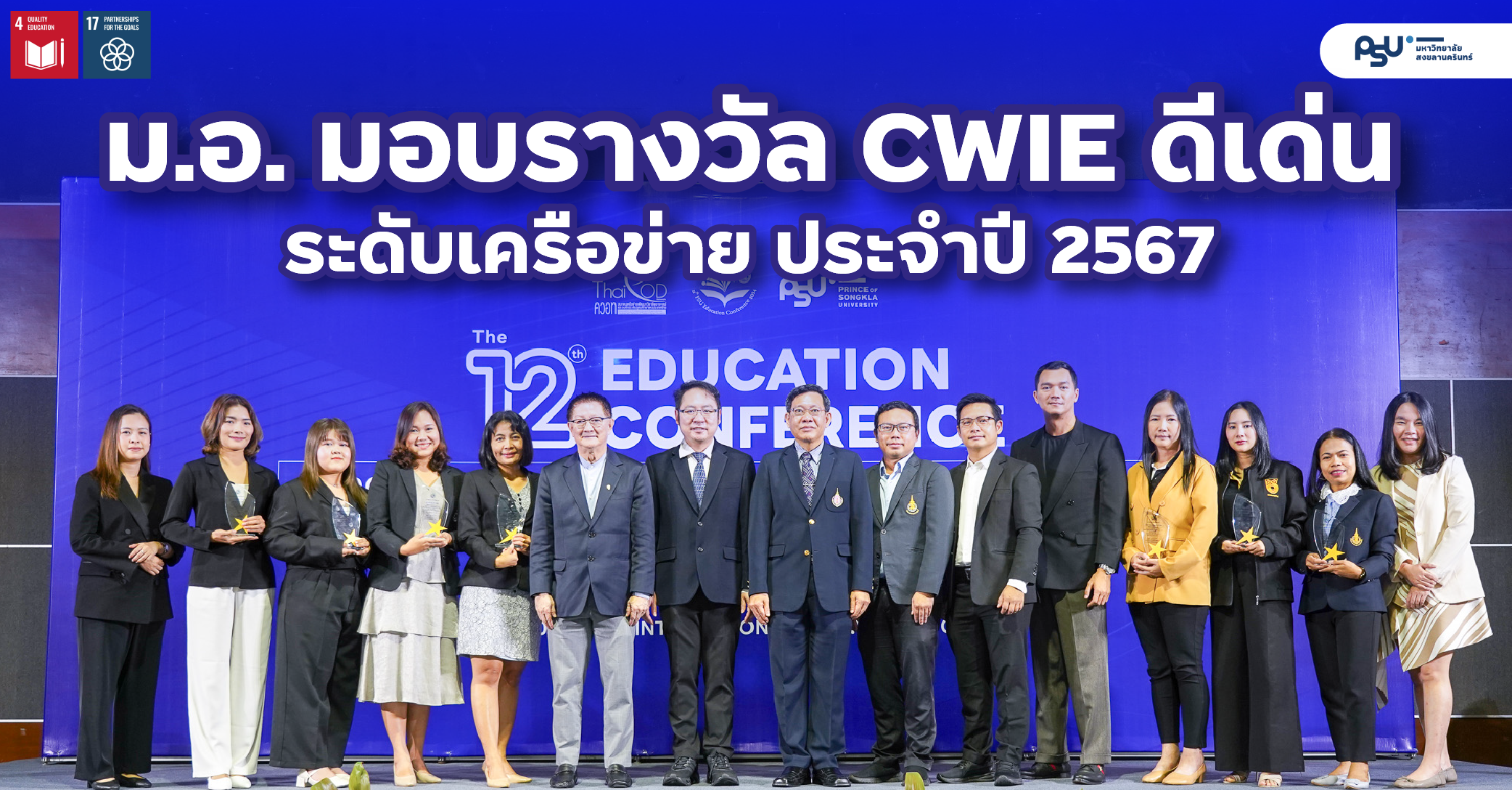 ผู้ช่วยศาสตราจารย์ ดร.เถกิง วงศ์ศิริโชติ รองอธิการบดีฝ่ายวิชาการและวิเทศสัมพันธ์มหาวิทยาลัยสงขลานครินทร์ มอบรางวัล CWIE ดีเด่น ระดับเครือข่าย ประจำปี 2567 ในงานประชุมวิชาการทางการศึกษาระดับชาติ ครั้งที่ 12 “The 12th PSU Education Conference” ภายใต้หัวข้อ “Bridging our future: Sustainable and Inclusive Education” และ Southern CWIE Forum 2024 จัดโดย มหาวิทยาลัยสงขลานครินทร์ ร่วมกับ สมาคมเครือข่ายการพัฒนาวิชาชีพอาจารย์และองค์กรระดับอุดมศึกษาแห่งประเทศไทย (ควอท) ณ Conference Hall ศูนย์ประชุมนานาชาติฉลองสิริราชสมบัติครบ 60 ปี มหาวิทยาลัยสงขลานครินทร์ อ.หาดใหญ่ จ.สงขลา เมื่อวันที่ 18 ธันวาคม 2567